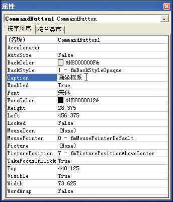 选中第一个命令按钮,点击右键,在弹出的快捷菜单中选择“属性”命令,打开其属性设置对话框,点击“Caption”右侧属性栏,将其内容改为“画坐标系”(如图2)。用同样的方法将另外两个命令按钮的“Caption”属性修改为“清空数据”和“清除图像”。